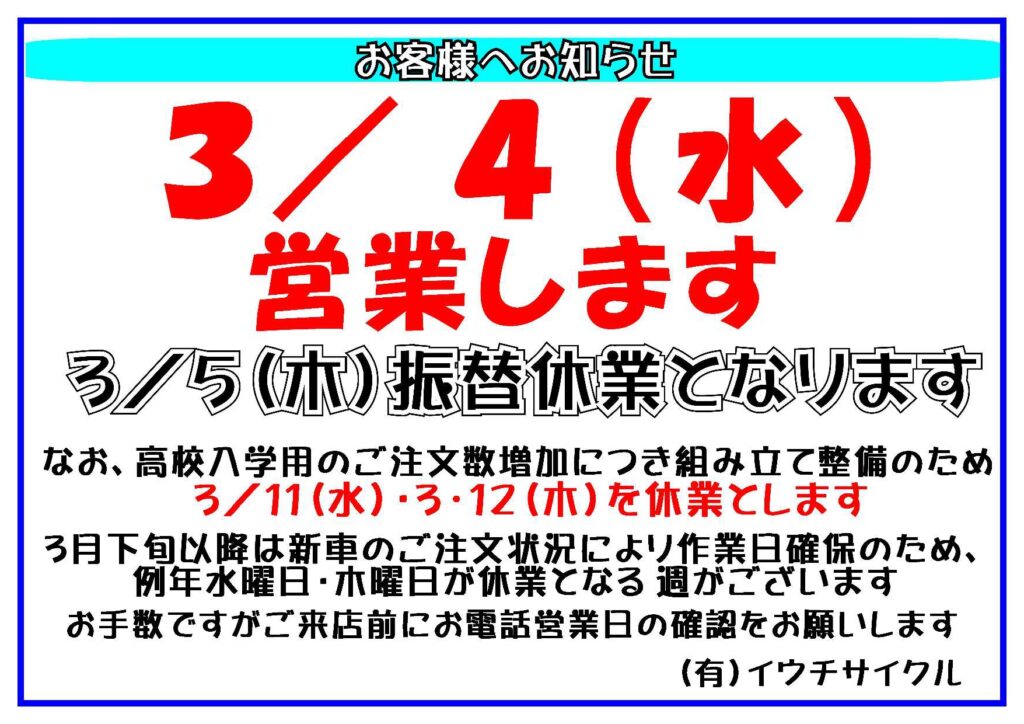 2026 3/4(水) 営業いたします 2026年02月20日 いつもイウチサイクルをご利用いただきありがとうございます 2026 3/4(水)は営業いたします なお、翌日3/5(木)は振替休業となります ご迷惑をおかけしますがご理解のほどお願い申し上げます