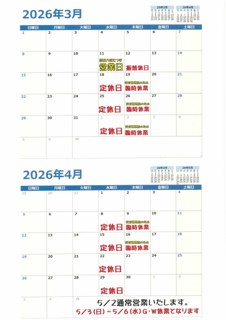 2026 3月 4月 営業日 2026年03月17日 いつもイウチサイクルをご利用いただきありがとうございます 3月、4月の営業日のお知らせをいたします 毎週水曜定休日に加えて木曜日も臨時休業いたしまして、ご注文の自転車をお仕上げさせていただきます 何卒ご理解のほどお願い申し上げます。